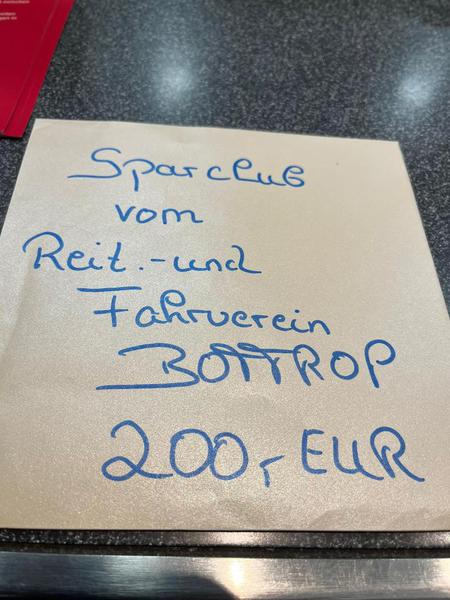 Schnell kam die Idee das WDR2-Weihnachtswunder zu unterstützen, was auf eine sofortige Zustimmung aller Sparer mit sich brachte. Nun wurde am heutigen Dienstag die Spendensumme von 200€ durch dem 1.Vorsitzenden des Reit- und Fahrverein Bottrop am Glashaus übergeben.
